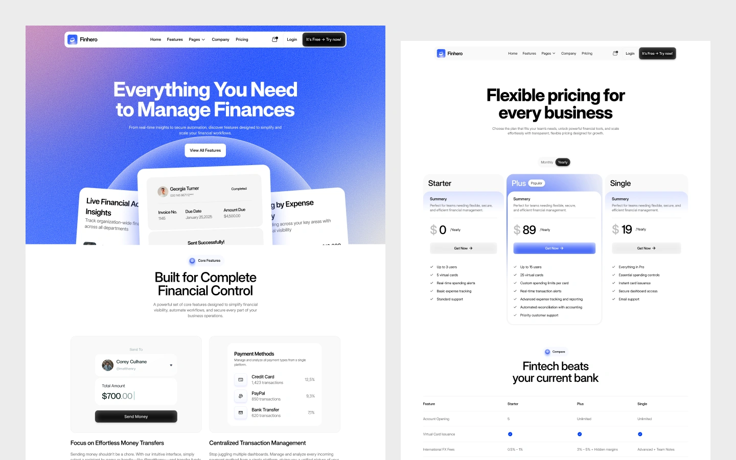Finhero is designed to convert visitors into users and clients. With strategic call-to-actions, pricing sections, testimonials, and onboarding flows, the template guides users toward signing up or getting in touch.