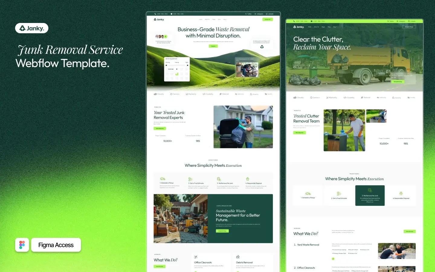 Janky is a sleek Webflow template for junk removal services, featuring fast, conversational experiences. Showcase your team, case studies, events, and more—perfect for highlighting your agency’s full potential.