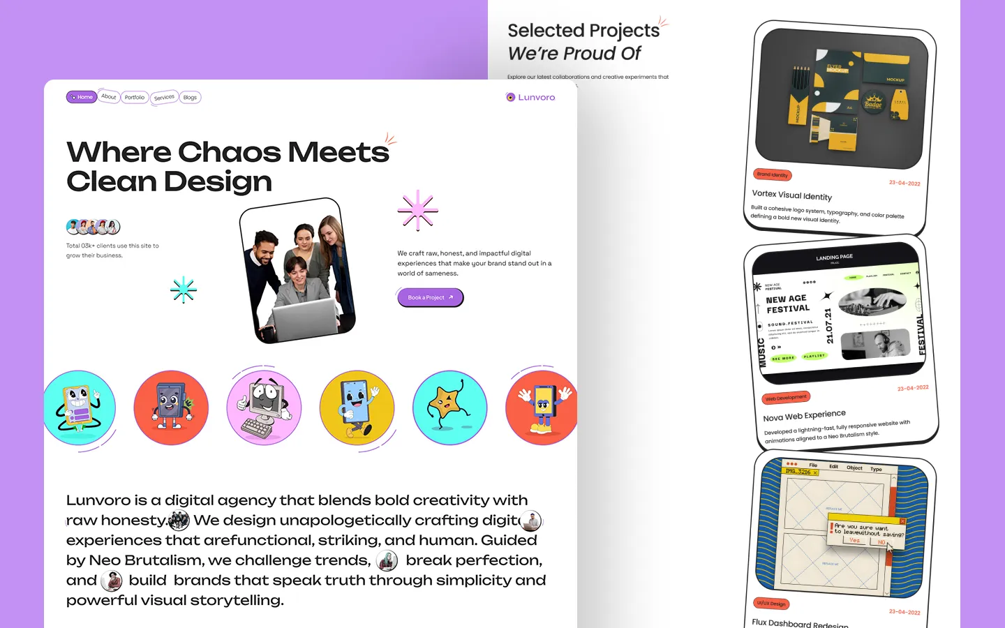 This Creative Digital Agency template is perfect for studios that want to craft bold visual identities and compelling digital experiences. With intentional design choices and strategic layout hierarchy, Lunvoro makes it easy for prospective clients to explore your work, understand your capabilities, and take action.