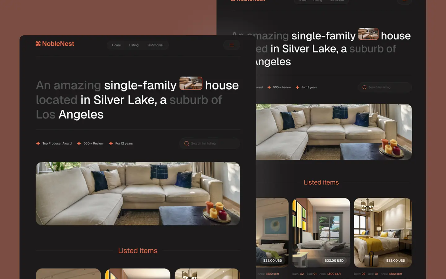 Noble Nest is a clean, conversion-focused Real Estate Webflow Template for agencies and property teams. Publish listings fast, showcase pricing and amenities, and turn visits into inquiries with responsive pages and CMS collections.