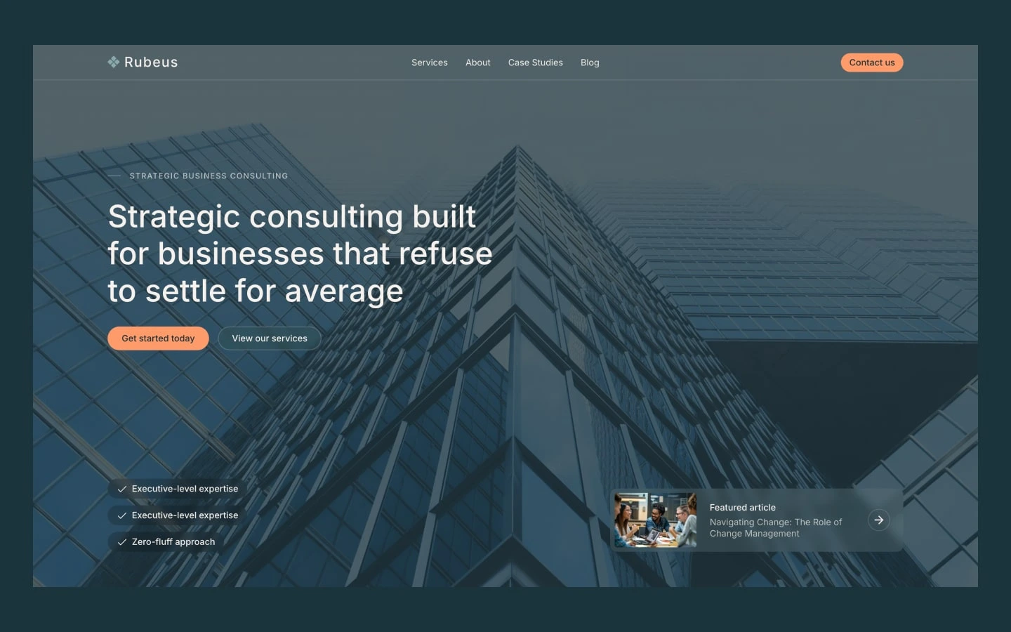 First impressions matter when you're competing for enterprise clients and high-value engagements. Rubeus combines modern design aesthetics with layouts proven to build trust and drive inquiries. Every page is crafted to position your firm as the authority clients want to work with.